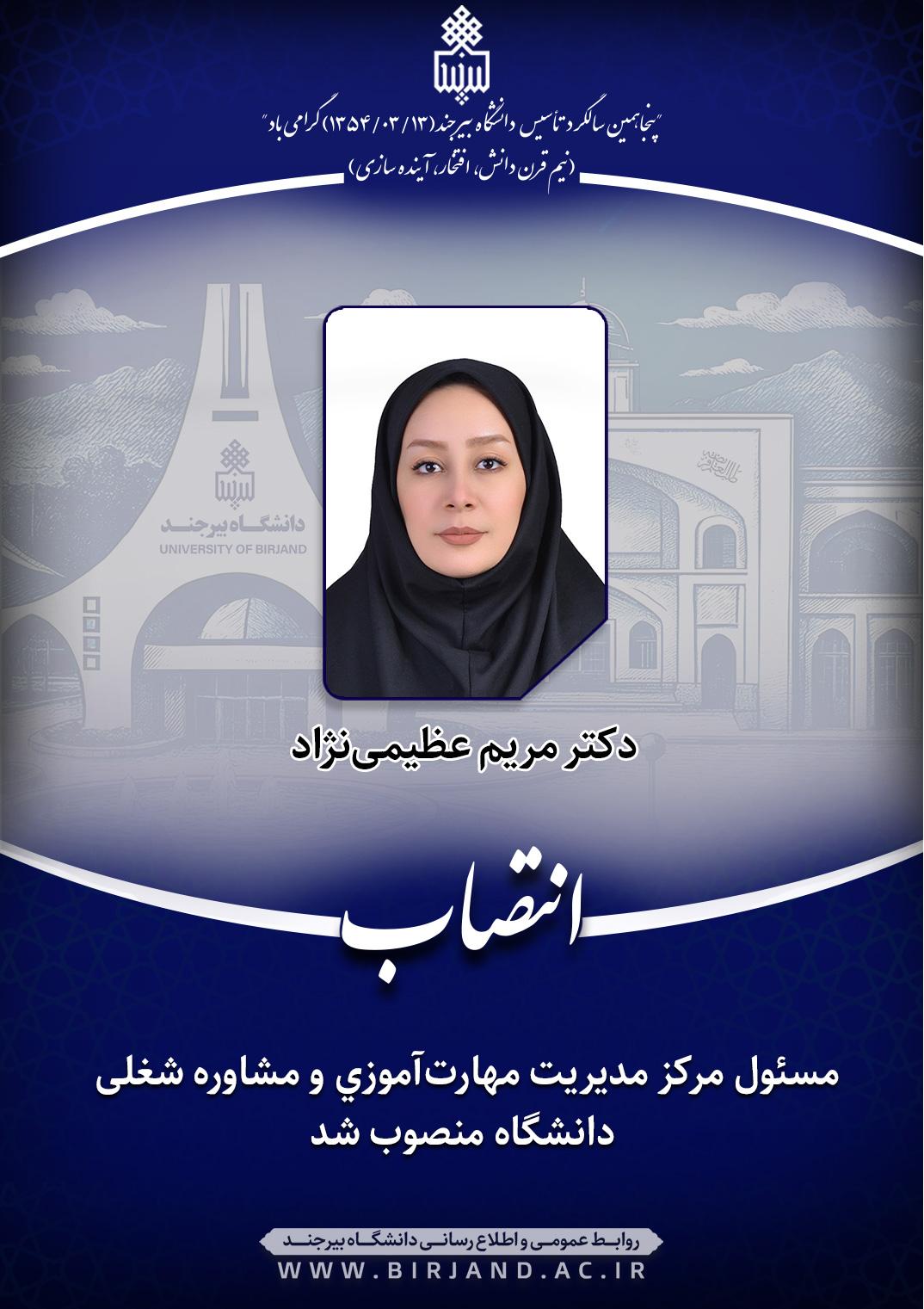دکتر احمد خامسان، سرپرست دانشگاه بیرجند، طی ابلاغی، دکتر مریم عظیمی‌نژاد، عضو هیأت علمی گروه آموزشی صنایع دستی دانشکده هنر را به عنـوان مسـئول مرکز مدیریت مهارت‌آموزی و مشاوره شغلی دانشگاه، به مدت دو سال منصوب کرد.