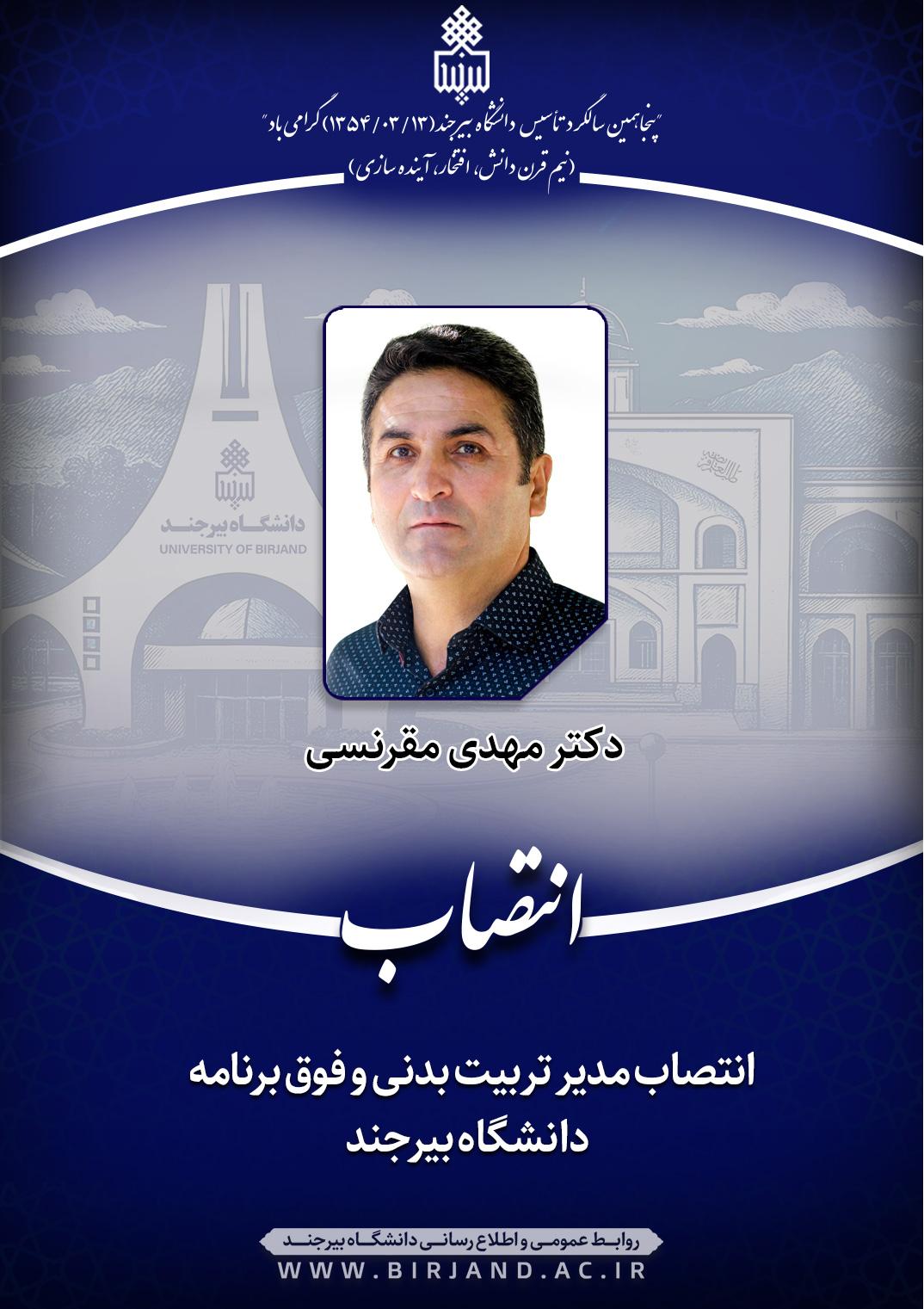 دکتر احمد خامسان، سرپرست دانشگاه بیرجند، طی ابلاغی، دکتر مهدی مقرنسی، عضو هیأت علمی گروه آموزشی علوم ورزشی را به سمت مدیر تربیت بدنی و فوق برنامه دانشگاه به مدت دو سال منصوب کرد.