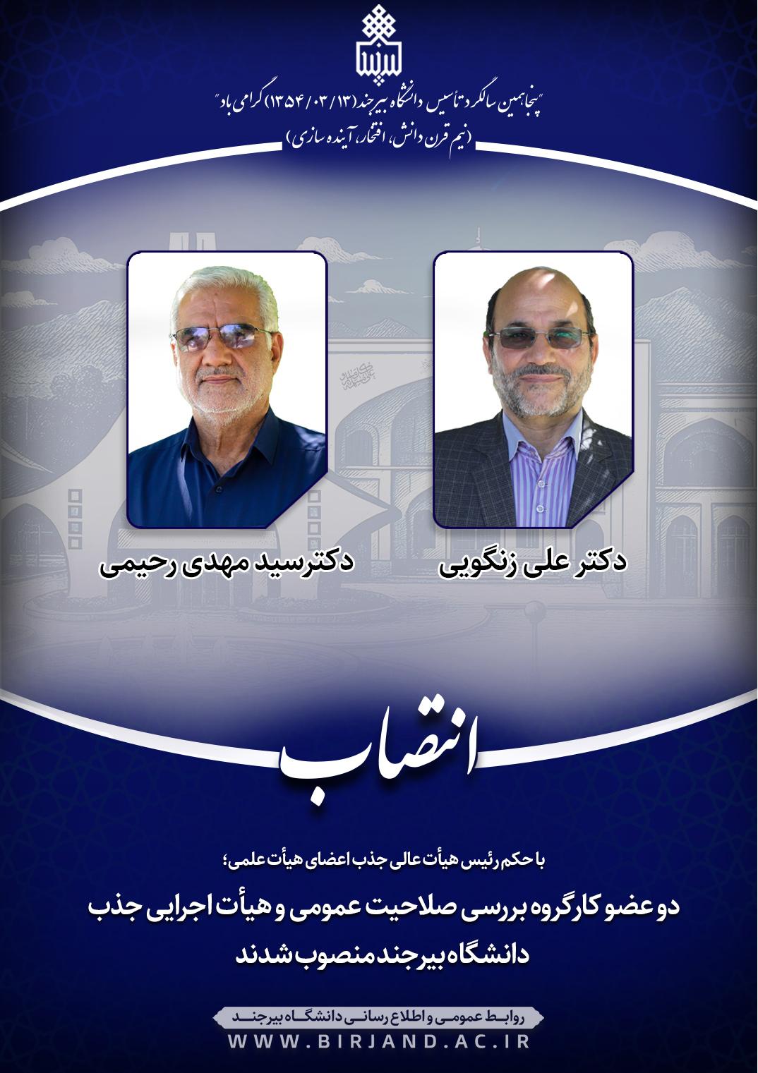 به گزارش روابط عمومی و اطلاعرسانی دانشگاه بیرجند، در بخشی از احکام انتصاب دکتر سیدمهدی رحیمی، عضو هیأت علمی گروه آموزشی ادبیات و دکتر علی زنگویی، عضو هیأت علمی گروه آموزشی معارف اسلامی دانشگاه بیرجند، آمده است؛ در اجرای مصوبه جلسه 608 شورای عالی انقلاب فرهنگی و به دنبال بررسی های انجام شده و نظر به سوابق و تجارب ارزشمند آن فرهیخته گرامی در حوزه آموزش عالی و بنا به تصویب جلسه 356 هیأت عالی جذب مورخ 15 مهر 1404، به موجب این حکم جنابعالی به مدت 4 سال به عنوان عضو کارگروه بررسی صلاحیت عمومی دانشگاه بیرجند منصوب میشوید.