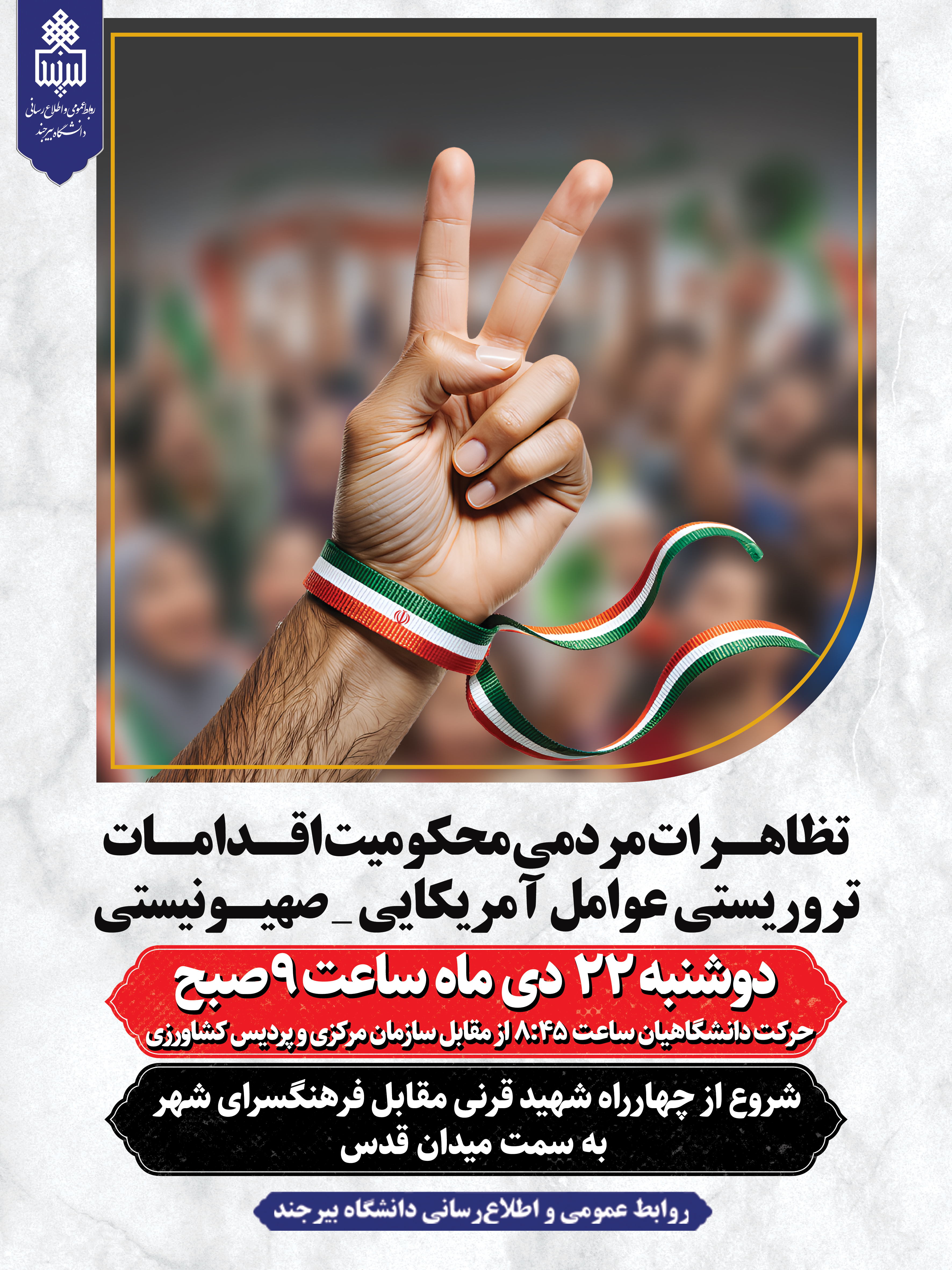 تظاهرات مردمی محکومیت اقدامات تروریستی عوامل آمریکایی ـ‌ صهیونسیتی با حضور باشکوه مردم و دانشگاهیان همیشه در صحنه، همزمان با سراسر کشور برگزار می‌گردد. بدینوسیله از دانشگاهیان محترم دعوت می‌گردد در این مراسم شرکت فرمایند.